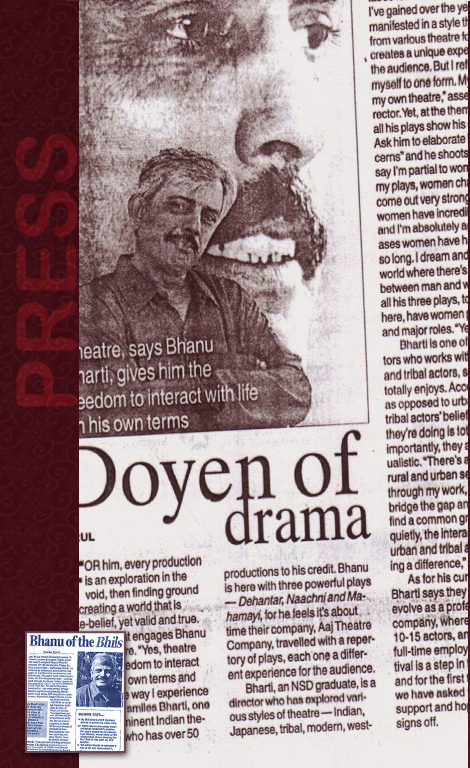 Indian Express, November 8, 2004. Liberation in theatre is his larger synopsis. His plays have a lyrical quality, but with strong political overtones. Times of Chandigarh, November 8, 2004. With Bhanu Bharti, actors get to contribute. Body language is at its best. A slight swivel of the head, a subtle smile says it all. Hindustan Times, November 9, 2004. Bhanu Bharti has drawn from different streams of theatre ….. to make the theatre of today. The Hindu, March 5, 2004. To invoke history, tradition or folk culture through theatre is one thing but addressing problems of the grassroots level to the top is quite a different endeavor. This is a passion that drives renowned theatre activist Bhanu Bharti. The Chandigarh Tribune, December 6, 2008. "Rituals are deeply imbedded in the psyche of an individual. My interaction with Bheels has opened up before me a whole world of fascinating rituals and their living connection with the community.” Interview, The Hindu, July 28, 2006. The central theme for the Republic Day Folk Dance Festival this year will be "Resurgent India". This will be presented by a lively ensemble of different folk dances, conch shell playing, Shahnai, Vedic hymn chanting, vibrant instruments like Sarangi, dhol and Khartal and Nagamandala floor painting from Kerala. The programme has been specially choreographed by famous choreographer and theatre personality, Shri Bhanu Bharti. PIB Press Release, January 2001. While conceiving his production of the play Bhanu is paying attention to realistic detail, to create a right ambience to enable his performers to reflect the inner conflicts of their characters. Bhanu is known for his productions of the plays that belonged to the Theatre of the Absurd. The Hindu, Dec 28, 2007. Handling pain and its elements on stage is perhaps the most challenging thing to do. But director Bhanu Bharati seems to have mastered the art of taking up such challenges. As his much revered production "Nachni" went on stage at Tagore Theatre on the second day of the ongoing National Theatre Festival, the lot of hapless women folk artistes stood bared for all to see. The Tribune, Chandigarh, September 18, 2003. |